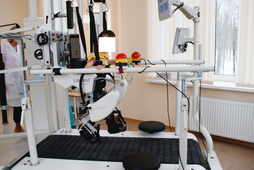 • Lokomat – комплекс беговой дорожки и специальных креплений, позволяющих пациенту самостоятельно двигаться, с целью формирования стереотипа ходьбы и ритма шага , тренировки проходят с использованием методики биологической обратной связи